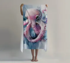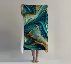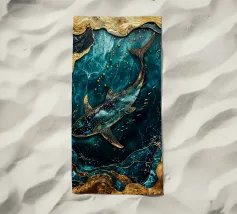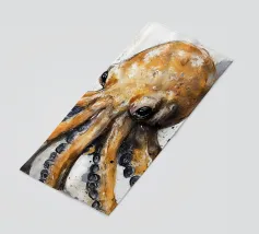 In un mare vorticoso di azzurri dorati, il polpo si muove alla deriva in un mosaico oceanico di verde acqua e blu. Ogni accento dorato sul suo corpo marmorizzato riflette un'eleganza ultraterrena, come se l'oceano stesso avesse intrecciato fili di metallo prezioso nella sua forma.