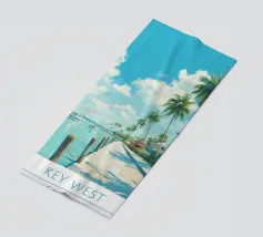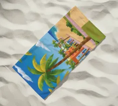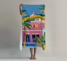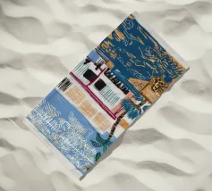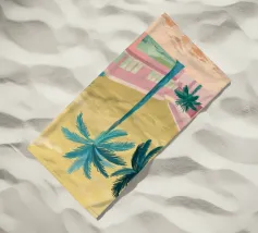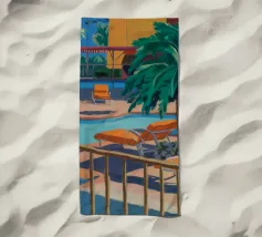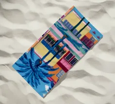Un dipinto di un edificio modernista con un caratteristico tetto angolato, probabilmente in un luogo come Palm Springs, caratterizzato da linee pulite, palme e una fresca luce blu.