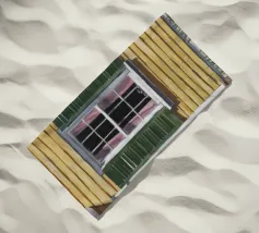 Un dipinto di un edificio modernista con un caratteristico tetto angolato, probabilmente in un luogo come Palm Springs, caratterizzato da linee pulite, palme e una fresca luce blu.