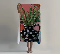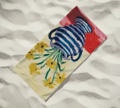 Una natura morta moderna e grafica di un bouquet di fiori gialli brillanti in un vaso a righe bianche e nere di grande effetto. Lo sfondo rosa tenue crea un delicato contrasto con i motivi e i colori audaci.