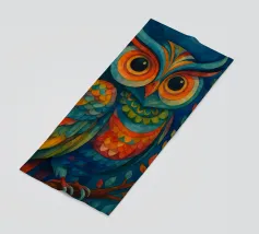 Un'affascinante illustrazione in stile cartoon di un gufo appollaiato con grazia su un ramo d'albero, circondato da vivaci foglie autunnali nelle calde tonalità del rosso, dell'arancio e dell'oro. Il gufo tiene in mano una tazza di sidro fumante, mentre la morbida luce dorata di un tranquillo tramonto illumina la scena. L'ambiente tranquillo e i dettagli stravaganti evocano l'accogliente bellezza dell'autunno.