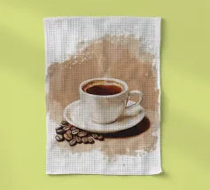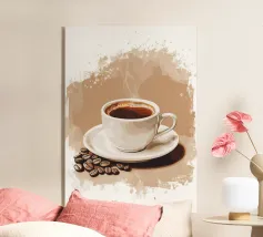 Una tazza di caffè nero su un piattino, circondata da chicchi di caffè sparsi - raffigurata in toni beige morbidi e caldi dal carattere pittoresco. L'immagine emana calma, concentrazione e piacere aromatico. Perfetto per gli amanti del caffè, per l'arredamento dei bar o per gli spazi di lavoro che hanno bisogno di promuovere un ambiente calmo ma elegante.