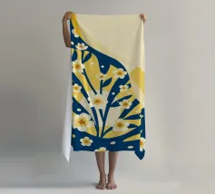 Un ramo stilizzato con foglie e bacche si staglia su uno sfondo astratto di forme blu, verdi e gialle. Le forme fluide e le morbide sfumature di colore danno un senso di armonia e di calma.