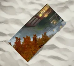 Una strada pittoresca è fiancheggiata da vivaci alberi autunnali e da edifici accoglienti, illuminati dalla luce soffusa delle lanterne in una serata piovosa, creando un'atmosfera serena.