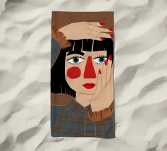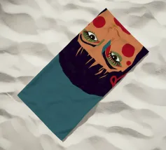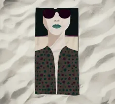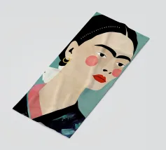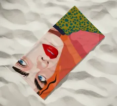 Un ritratto grafico di grande impatto di una donna con un'acconciatura nera e labbra rosse, con lo sguardo intenso rivolto all'osservatore, su uno sfondo colorato e astratto.