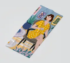 Un ritratto grafico di grande impatto di una donna con un'acconciatura nera e labbra rosse, con lo sguardo intenso rivolto all'osservatore, su uno sfondo colorato e astratto.