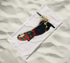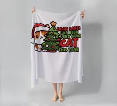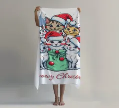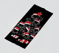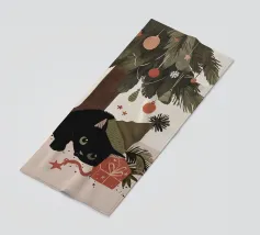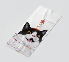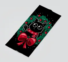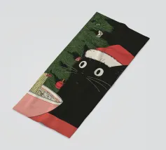 Un gatto nero che indossa un cappello da Babbo Natale è spiritosamente impigliato in luci natalizie colorate. Il testo accanto al gatto recita: "È abbastanza allegro?".