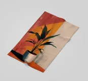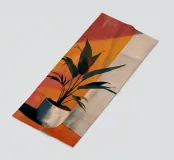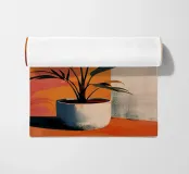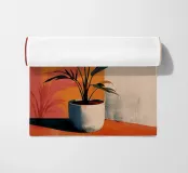 Un vibrante dipinto a olio raffigurante una pianta tropicale in vaso, ricco di toni caldi e contrasti decisi. I rossi profondi, gli arancioni e le tonalità dorate evocano calore e vitalità, mentre le pennellate strutturate aggiungono profondità e drammaticità a questa composizione lussureggiante in un interno vintage e all'avanguardia.