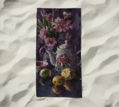 Una natura morta all'aperto raffigura un tavolo con una ciotola di limoni giallo brillante e una bevanda, all'ombra di un albero con fiori o fogliame viola, che suggerisce un momento sereno in un ambiente mediterraneo.