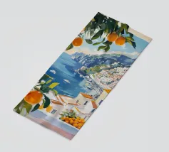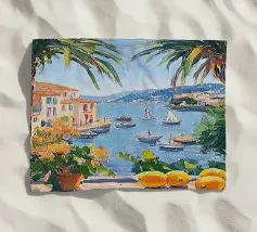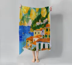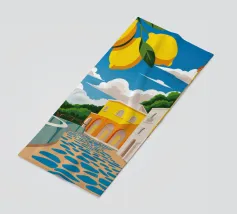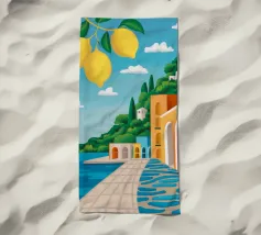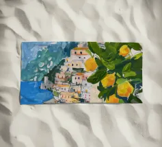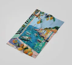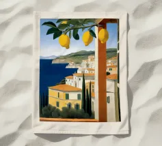 Una vista pittoresca di una città di mare, splendidamente incorniciata da un ramo di limone carico di frutti. La scena è una rappresentazione vibrante, solare e idilliaca di una perfetta fuga nel Mediterraneo.