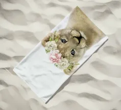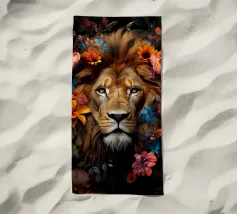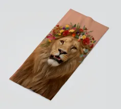 Il ritratto di un leone mostra grandi occhi espressivi e una corona floreale in bianco e nero. La morbida pelliccia è perfettamente enfatizzata in un'illustrazione fotografica minimalista e cattura lo straordinario fascino della natura. Ideale per gli amanti degli animali.