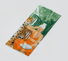 This artwork captures a person in a black dress striking a poised pose beside a leopard. The scene exudes sophistication, confidence, and timeless artistry.
