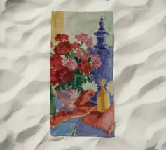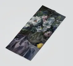 Una natura morta con una brocca d'argento riempita con un rigoglioso bouquet di lillà viola e rosa. Un bicchiere di vino rosso e della frutta si trovano su una superficie scura e lucida che riflette gli oggetti.