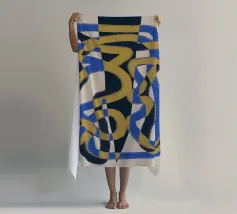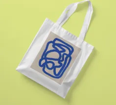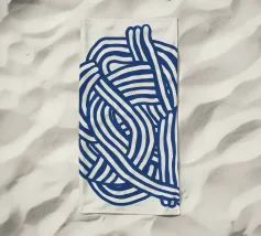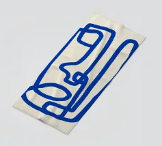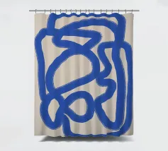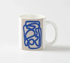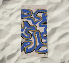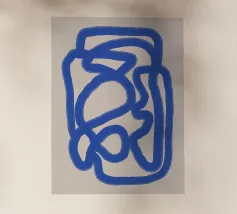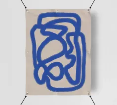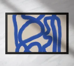 Una spessa linea blu serpeggia su uno sfondo neutro, creando un motivo astratto dalle forme audaci e curvilinee. La semplicità del disegno enfatizza il movimento e il flusso della linea continua.