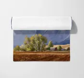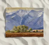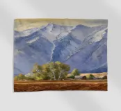 Una maestosa e ben definita catena montuosa con cime innevate si erge drammaticamente sopra una pianura agricola, la cui forma possente è resa con dettagli realistici e un'illuminazione drammatica.