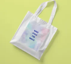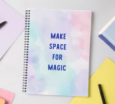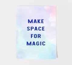 "Fai spazio alla magia" in caratteri blu su uno sfondo acquerellato pastello con una sfumatura di colore dall'azzurro al rosa. Un design onirico e creativo, pieno di leggerezza, ispirazione e delicata auto-riflessione.