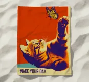 Questo affascinante poster motivazionale combina una fotografia giocosa con un'estetica vintage. L'intensa combinazione di colori bicolore, arancione brillante e viola intenso, ricorda le serigrafie psichedeliche degli anni Sessanta. Il gatto curioso che raggiunge la farfalla monarca simboleggia la gioia infantile e l'esperienza consapevole. Lo slogan "MAKE YOUR DAY" sottolinea il messaggio positivo senza essere invadente. L'elaborazione dell'immagine in formato poster conferisce all'opera una chiarezza grafica. Una dichiarazione sulla gioia di vivere, sulla curiosità e sulla ricerca della felicità nei piccoli momenti - ispiratrice e decorativa.
