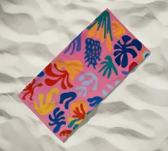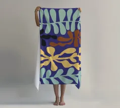 Un motivo di foglie stilizzate nei toni del verde, del rosa e della terracotta, ispirato ai ritagli di Henri Maraoui. La disposizione suggerisce una danza aggraziata di forme botaniche.