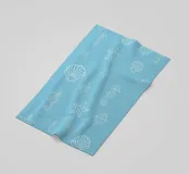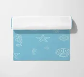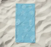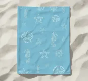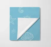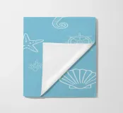 Un motivo ludico di ispirazione marittima che evoca immediatamente l'estate, la costa e l'aria salmastra: illustrazioni di cavallucci marini, stelle marine, ruote di navi, conchiglie e coralli dai contorni bianchi si muovono su uno sfondo azzurro, distribuiti uniformemente e con dimensioni e orientamenti diversi. La composizione sembra un'immersione grafica nei ricordi del Mediterraneo.