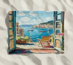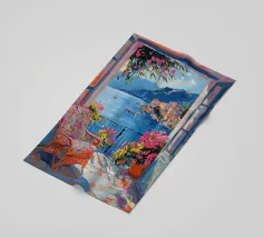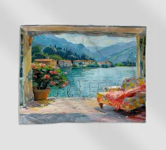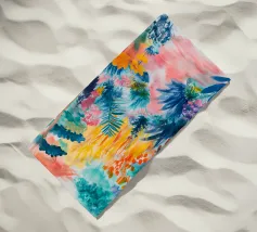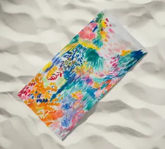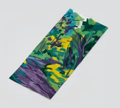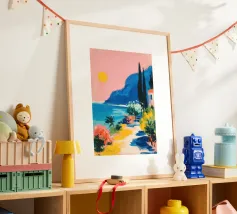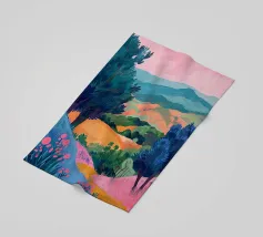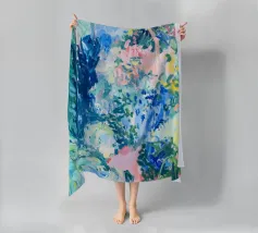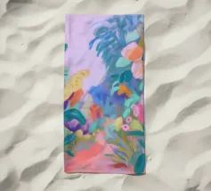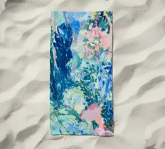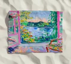 Un sentiero che attraversa un giardino all'inglese, circondato da una vegetazione vivace e da fiori sbocciati nei toni del rosa, del viola, del blu, del giallo e del verde acqua, dipinti con audaci pennellate di pittura acrilica, creando una scena vibrante e colorata che ricorda lo stile di Matisse. I colori sono brillanti e saturi e aggiungono profondità alla composizione, mentre le ombre morbide aggiungono dimensione a elementi come alberi, fogliame, cespugli e rocce. Questo dipinto evoca gioia e giocosità, creando un effetto allegro.