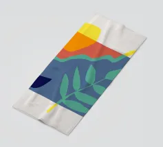 Un disegno botanico minimalista presenta un ramo bianco delineato con foglie. Linee curve e forme organiche nei toni del blu, del verde e del giallo creano uno sfondo moderno e astratto.