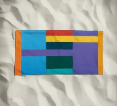 Le forme geometriche si intersecano e si sovrappongono in una complessa rete di linee e colori, creando un'estetica astratta e moderna. Diverse tonalità, tra cui giallo, verde, viola e blu, si stagliano su uno sfondo neutro, aggiungendo vivacità alla composizione angolare.