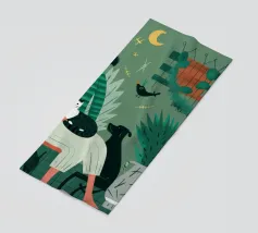 Un motivo vivace e senza soluzione di continuità di foglie stilizzate e forme botaniche in una tavolozza di rosso, blu, rosa e giallo, che crea un senso di movimento ritmico e naturale.