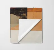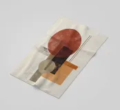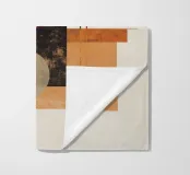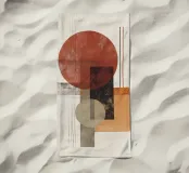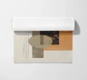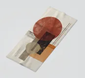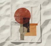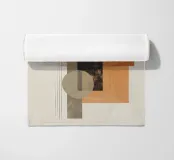Un'audace opera d'arte astratta con cerchi, rettangoli e linee sottili in rosso ruggine, nero, beige e arancione. La finitura strutturata conferisce un tocco vintage, rendendola ideale per interni moderni, boho o di metà secolo.