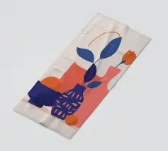 Una moderna natura morta astratta con una pianta stilizzata in un vaso blu, un croissant e forme organiche sotto un sole giallo, il tutto in una composizione equilibrata e calda.