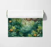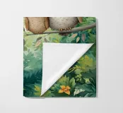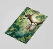 Un'affascinante scena di una mamma gufo che coccola il suo piccolo in una vivace giungla tropicale. Questo dolce disegno faunistico dona calore e un delicato tocco di natura a qualsiasi ambiente.