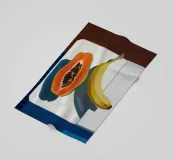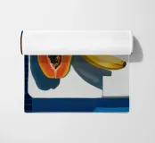 Una natura morta realistica ma stilizzata di una papaya e una banana su una superficie bianca, immersa in una forte luce solare diretta. Il gioco di luci e ombre lunghe crea una composizione drammatica e moderna.