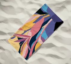 Un'illustrazione splendidamente dettagliata cattura l'eleganza di un'orchidea in fiore, con vibranti petali rosa, bianchi e gialli contrapposti a foglie blu intenso.