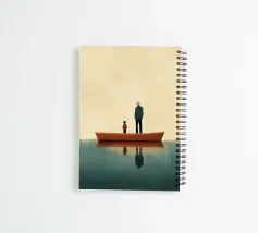 A minimalist, flat illustration of an old man standing on the edge of a boat with his son. Both are looking away from the camera, with a simple background and soft colours that convey a peaceful and serene atmosphere and a sense of calmness in their demeanour. The focus is on capturing subtle expressions and details that convey depth without being overwhelming or cluttered. This style reflects Scandinavian minimalism while maintaining emotional intensity.
