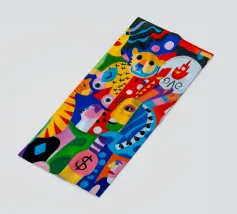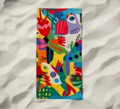 Un paesaggio surreale pieno di figure astratte, animali e forme geometriche. L'uso dinamico di colori vivaci e disegni intricati evoca immaginazione e curiosità.