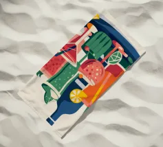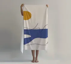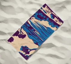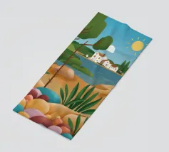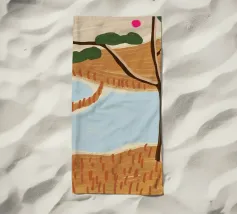 Raffigura un paesaggio tranquillo con uno specchio d'acqua in primo piano. Erbe alte e canne costeggiano l'acqua. Al centro, alberi dal tronco rosato e dal fogliame verde. Lo sfondo è caratterizzato da colline ondulate nei toni dell'arancione, del giallo e del verde, con un cielo blu e nuvole bianche in alto.