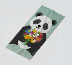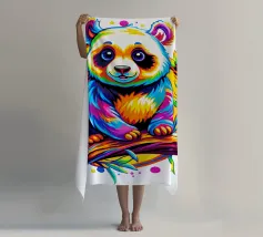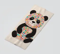Illustrazione colorata di un simpatico panda con un ramo di bambù. Il motivo giocoso combina cordialità, calma e aree di colore moderne - ideale per i fan dei panda e per i disegni creativi di animali.