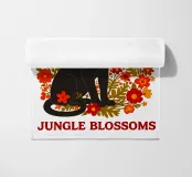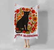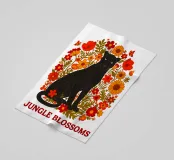 Sagoma di pantera nera circondata da fiori arancioni e rossi. Tavolozza calda, motivo floreale caratteristico; ideale per progetti audaci, tessuti grafici e accessori.