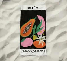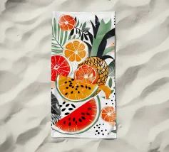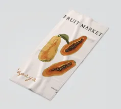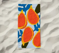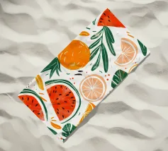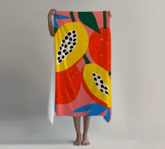 Un'illustrazione vivace e stilizzata di papaya a fette con foglie verde scuro su uno sfondo chiaro. Il motivo ripetitivo e il colore arancione brillante creano un'atmosfera fresca e tropicale.