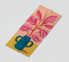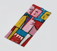 Una composizione astratta presenta una ciotola di fragole in mezzo a un turbinio di forme e motivi organici e colorati, creando un'interpretazione fresca e moderna di un classico dell'estate.