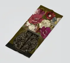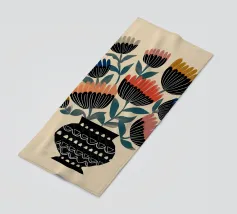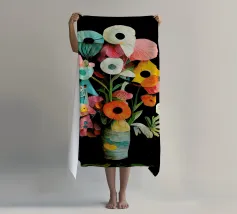 Un vaso dalla splendida fantasia racchiude un vivace bouquet di fiori, con una farfalla che si posa graziosamente in cima. La composizione presenta varie fioriture, tra cui le viole del pensiero, su uno sfondo scuro che ne mette in risalto i colori vivaci.