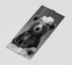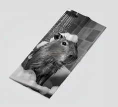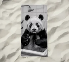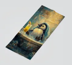 Un pulcino di pinguino è circondato da soffici bolle mentre è seduto in una vasca da bagno. L'ambientazione del bagno e l'atmosfera giocosa creano una scena affascinante e stravagante.
