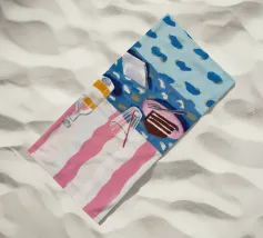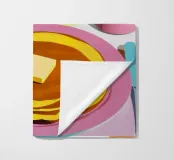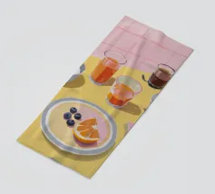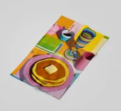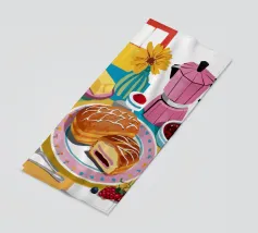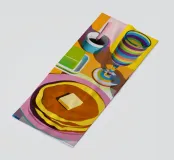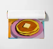 A delicious stack of golden brown pancakes, topped with a melting pat of butter and drizzled with syrup, is the star of this artwork. Presented with colorful mugs, the illustration is a mouth watering celebration of a classic, beloved breakfast treat.