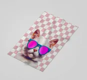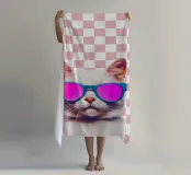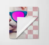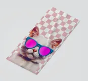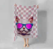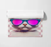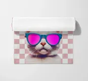 Un elegante gatto bianco che sfoggia audaci occhiali da sole su uno sfondo a scacchiera rosa di tendenza. Fresca, sicura di sé e senza sforzo chic, quest'opera d'arte conferisce un'estetica giocosa e moderna a qualsiasi spazio.