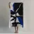 Grandi forme astratte nere si intrecciano con audaci accenti blu, su uno sfondo neutro con sezioni geometriche. La composizione crea un forte contrasto e interesse visivo grazie all'uso dello spazio negativo e del blocco dei colori.