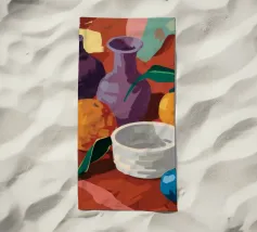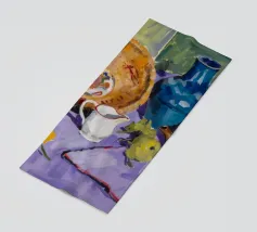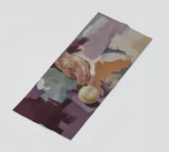 Una natura morta o una scena di raccolto con una grande zucca arancione, peperoncini rossi e foglie verdi, forse sulla vite. Lo sfondo è un mix di toni caldi e freddi.