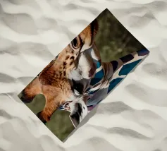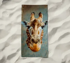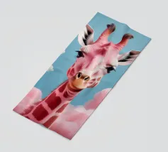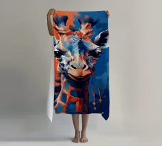 Una giraffa si staglia in primo piano, ornata da motivi vivaci e colorati. Lo sfondo è una sfumatura liscia, che esalta l'aspetto unico della giraffa in un ambiente vivace.
