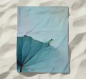 Questa opera d'arte mostra una piccola rana tropicale seduta sul bordo di una grande foglia blu. I tenui colori pastello e lo sfondo minimalista conferiscono all'immagine un senso di calma e leggerezza. Un motivo naturalistico moderno che unisce esotismo ed eleganza.
