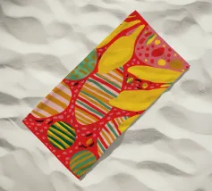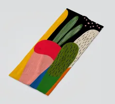 A vibrant and eclectic pattern featuring stylized red creatures, possibly foxes or cats, interspersed with colorful vases and plants. The composition is a playful and imaginative tapestry of recurring motifs.
