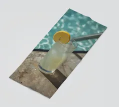 The photograph captures a serene moment on a sun-drenched rooftop in Marrakech, where the vibrant blue sky meets the tranquil waters of a polished, neutral beige-colored pool. A glass of crystal-clear water stands gracefully beside the pool’s edge, catching the sunlight, which reflects off the smooth surface of the water. The surrounding pool bath , with its warm, neutral tones, enhance the calm, minimalist elegance of the scene.