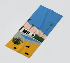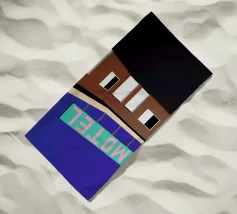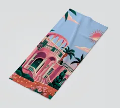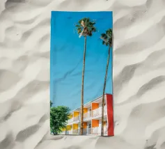 Una classica insegna retrò "MOTEL" risplende contro un cielo serale blu intenso, affiancata da palme in primo piano. L'immagine cattura un'atmosfera nostalgica e cinematografica che ricorda un classico viaggio americano in macchina.